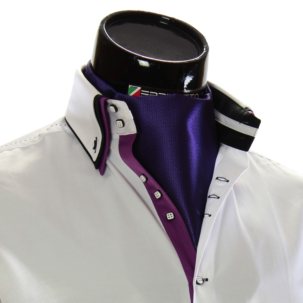 Модний і стильний атрибут під сорочку для чоловіків - шийна хустка Аскот. Модель шийної хустки виконана у фіолетовому кольорі в розписний візерунок з контрастним відтінком. Призвичаївшись майстерно підбирати і застосовувати чоловічі аксесуари до сорочки, можна до невпізнання змінювати свій образ. У такому виконанні чоловічого шийну хустку Аскот можна купити тільки в нашому інтернет магазині. Особливо гармонує з високим коміром, потрійним коміром (Tripple Collar) або подвійним коміром (Double Collar).