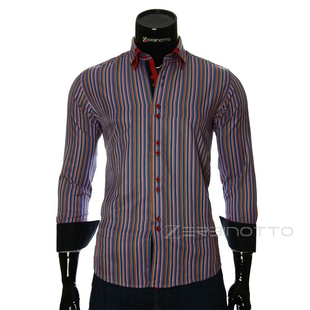 Stylish men's slim fit shirt of Bellino collection. The shirt is made in a beautifully combined multi-colored strip. The collar of the shirt is double for men on buttons, highlighted by the contrasting color of the distinctive tonality. Man's cuffs are double-sided. The design of the cuffs is used in a contrasting color pattern. The inner line for the buttons is made in stripe by a tonality in combination with the collar.