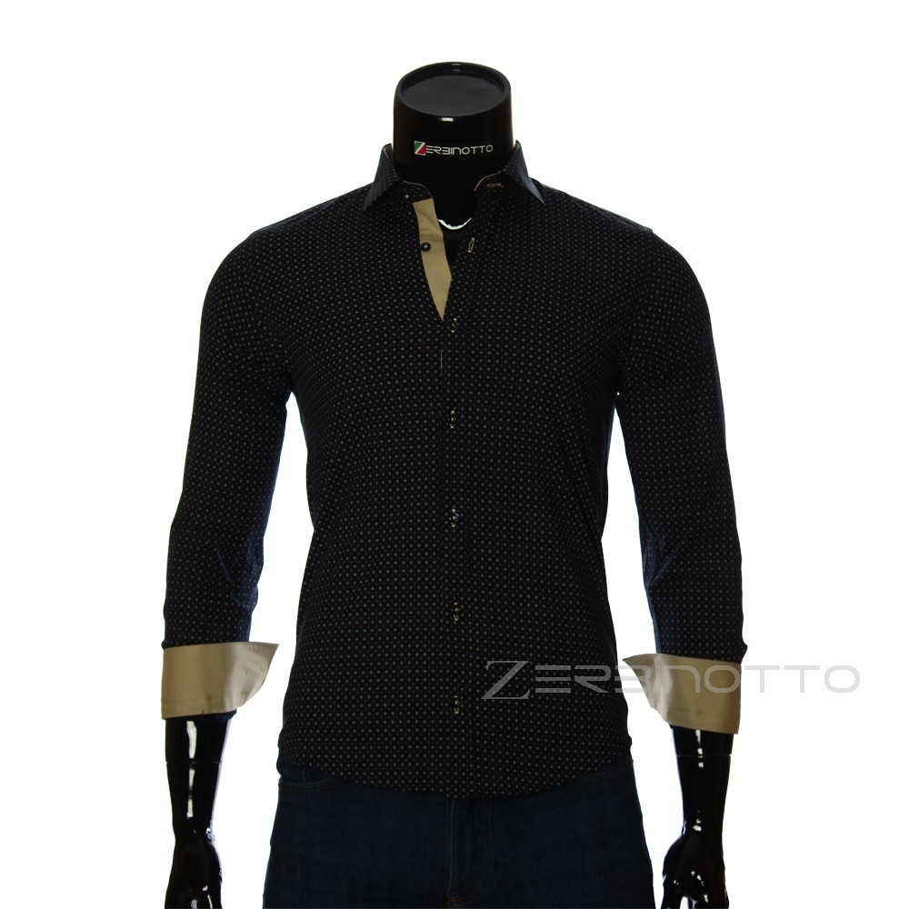 Men's blue shirt in diamond pattern with a slanting collar. The collar of the shirt is slanting. The shirt makes your style unique. And this style adds a highlight of the unusual collar and double-sided cuffs. 100% cotton with the addition of lycra makes the shirt pleasant to the body. The shirt can be worn by wrapping the cuffs on the wrist or by the elbow. The shirt is combined with jeans and trousers. Over the shirt can be worn Casual blazer blazer monophonic or in a pattern. The color of the jacket under the shirt can be chosen in accordance with your wishes and mood, but that would be the same shade as on the shirt.