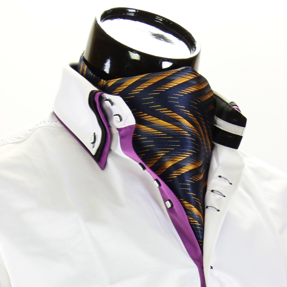 Мужской шейный платок аскот (галстук аскот) носится как повседневно, так и по торжественному случаю. Данная модель шейного платка гармонично подходит под классические рубашки белого, лилового, сиреневого, фиолетового, черного, коричневого, синего, изумрудного, красного, розового и желтого (сафроного) цвета, а также цвета айвори. Подбирать рубашку лучше всего однотонную, но в качестве исключения можно и в клетку и полоску. Ну а если рубашку в узор, вообще идеальное сочетание. Рекомендуем подобрать рубашки под платок, которые мы подобрали специально для вас из нашего ассортимента, исходя из цветовой палитры именно самого шейного платка. Данный шейный платок аскот идеально подходит к рубашкам с высоким воротом, двойным или тройным воротом, которые имеются у нас в достаточном количестве в разделе рубашки.