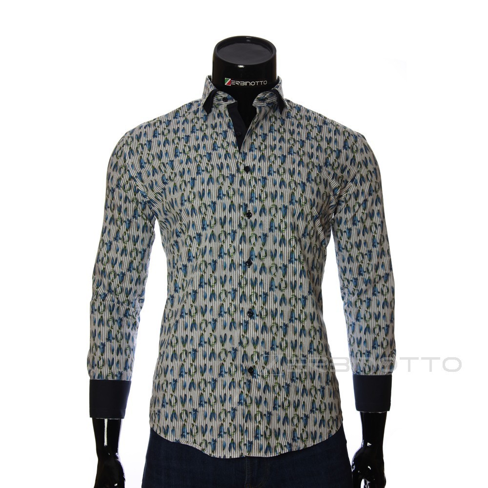 Мужская рубашка в узор с двусторонними манжетами. Ворот двойной Double Collar. Мужская рубашка синего цвета в цветочный узор с полоской. Рубашка мужская коллекции Nino делает Ваш стиль неповторимым. Хлопок делает рубашку приятной к телу. Рубашка сочетается с джинсами и с брюками. Идеально подходит для повседневного стиля. Цвет пиджака под рубашку можно выбрать в соответствии с вашими пожеланиями и настроением. И идеально рубашка сочетается с деловыми костюмами.