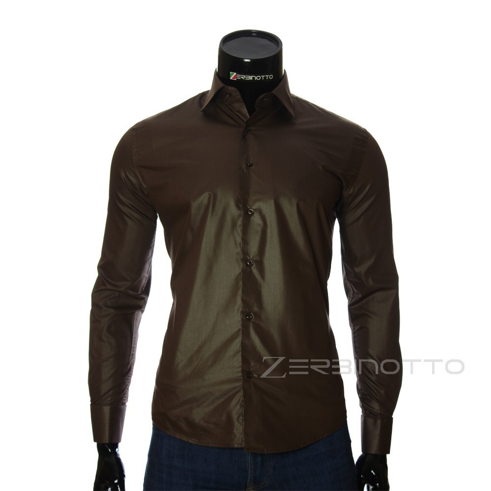 Чоловіча брендова сорочка коричневого кольору з роскосим коміром. Країна бренду Італія. Дистрибютор Zerbinotto EU. Тканина сорочки виконана під лазерне полірування, що надає сорочці багатий блиск. Сорочка чоловіча Zerbinotto робить Ваш стиль неповторним. 100% бавовна робить сорочку приємною до тіла. Сорочка поєднується з брюками і класичними костюмами. Ідеально підходить для вибору краватки. Колір піджака під сорочку можна вибрати відповідно до ваших побажань і настроєм.