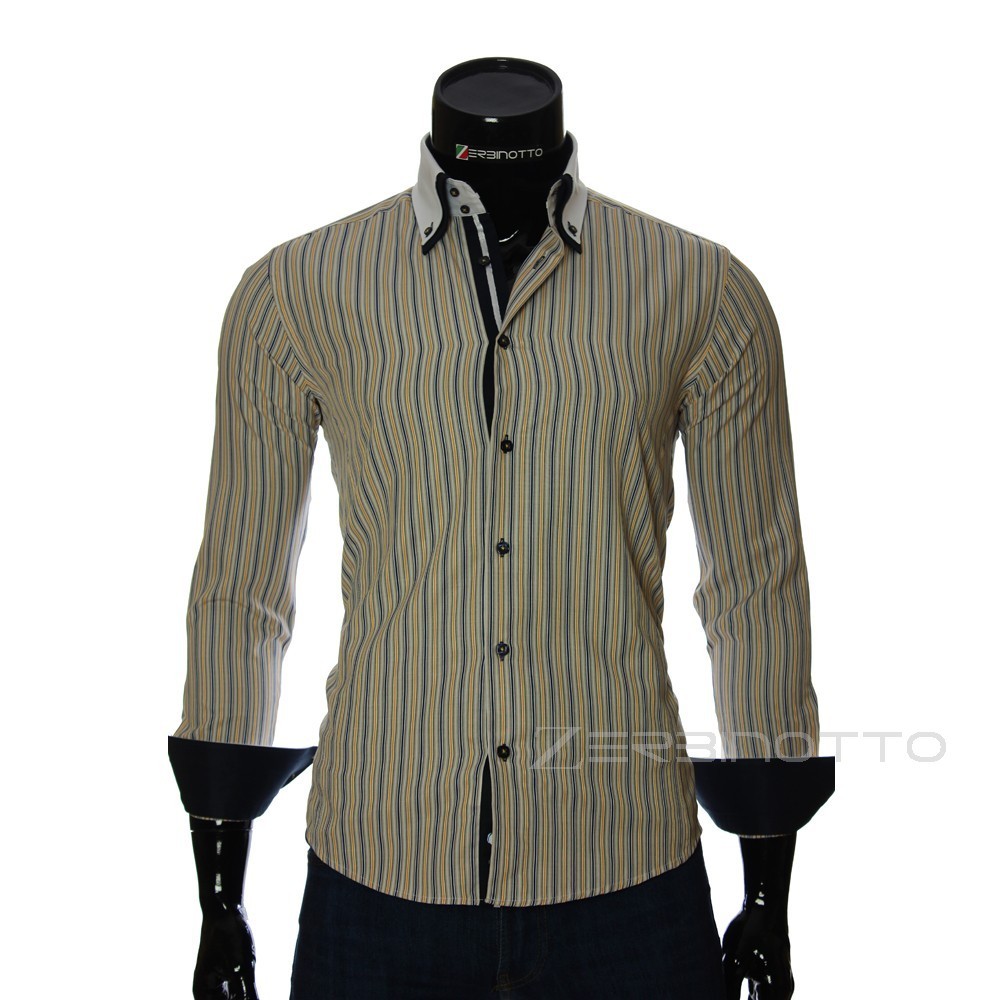 Стильна сорочка чоловіча приталеного крою. Виконана сорочка в смужку в різнокольорових тонах. Дана чоловіча сорочка приталеного крою виконана з використанням подвійного коміра DoubleCollar на ґудзиках і двосторонніх манжетів. Манжети двосторонні, а також використання контрастного кольору на внутрішній стороні коміра і манжета. Дана сорочка відмінно підходить для святкових заходів, святкова і оригінальна.