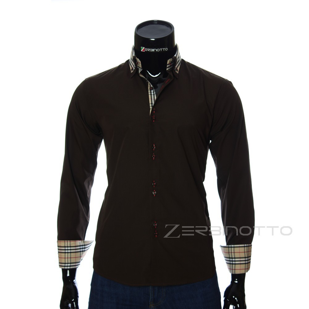 Стильна чоловіча сорочка приталена. Виконана сорочка в однотонному кольорі. Колекція La Griffe в даній моделі чоловічої сорочки представлена з використанням таких модних деталей, як роскосий так і подвійний комір Button Down на ґудзиках і двосторонні манжети. І на комірі і на манжетах, в якості декору, нашиті в візерунок принт лінії. Лінія гудзиків по дві навряд. Внутрішні сторони коміра і лінії гудзиків виділені вставками з принтом.