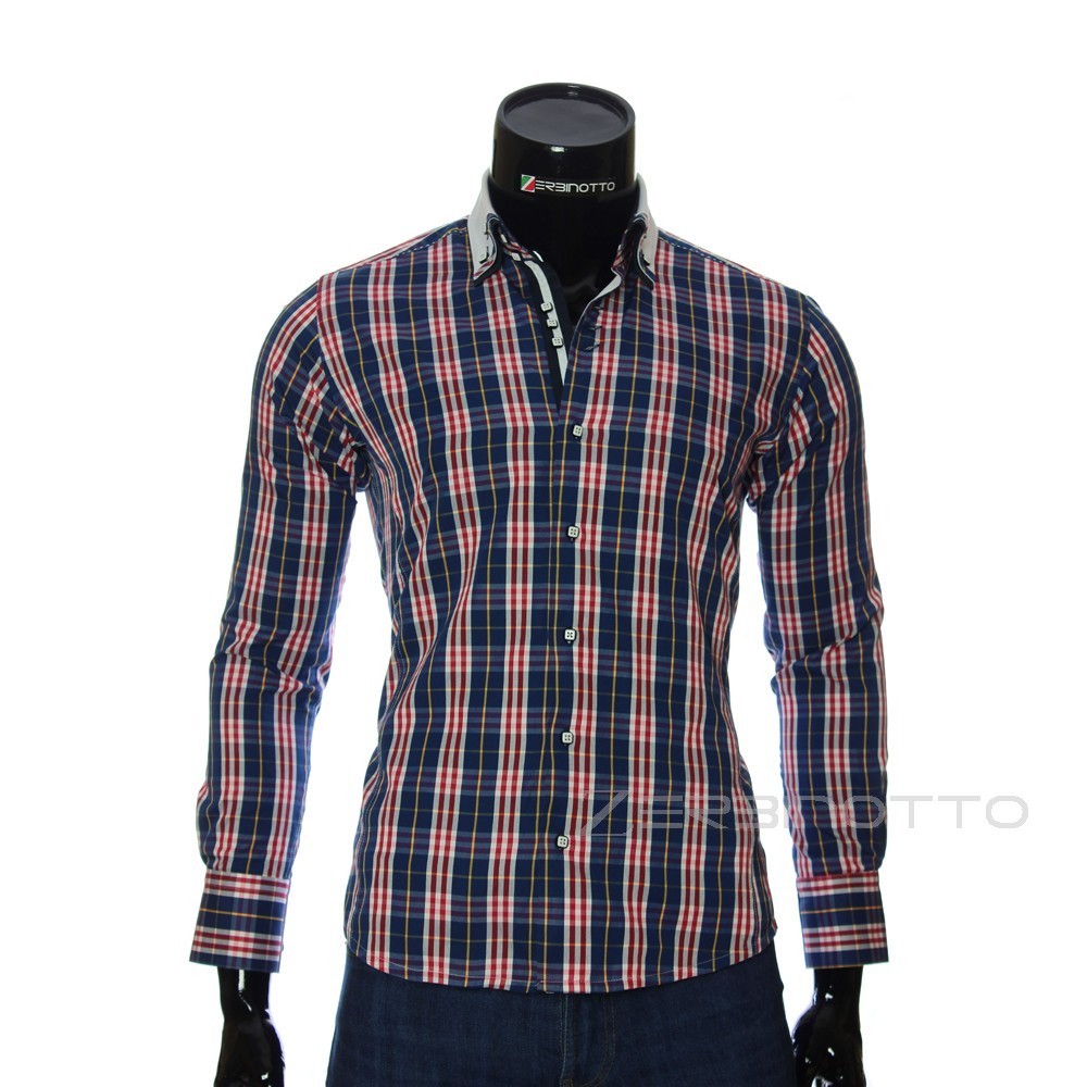Стильна чоловіча сорочка приталена. Виконана сорочка в однотонному кольорі або в стилі Burberry. Колекція Mario створена в даній моделі чоловічої сорочки з використанням таких штрихів, як подвійний комір Button Down на ґудзиках і двосторонні кутові манжети. І на комірі і на манжетах, в якості декору, нашиті у візерунок принт лінії Burberry. Верхня лінія гудзиків три навряд. Внутрішні сторони коміра і лінії гудзиків виділені вставками Burberry.